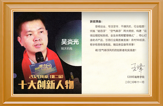 1、雷茨總經(jīng)理吳炎光榮獲環(huán)境商學(xué)院2020屆“十大創(chuàng)新人物”,傾心打造奇點(diǎn)產(chǎn)品“空氣懸浮風(fēng)機(jī)”和“磁懸浮風(fēng)機(jī)”;